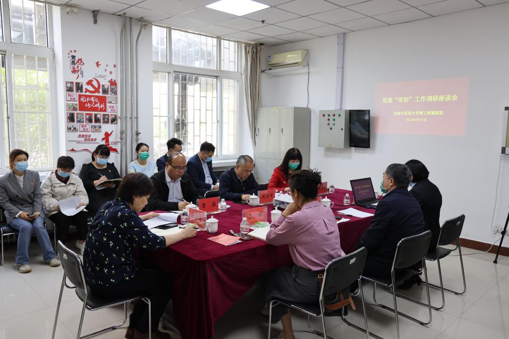 本网讯(文/李冕 图/潘向昆)为贯彻落实全国高校党的建设工作会议精神,深入学习贯彻习近平总书记关于加强高校党建工作的重要论述,落实《中国共产党普通高等学校基层组织工作条例》,不断推动“能力作风建设年”活动走深走细走实,2022年4月21日上午,校党委副书记李小芳带领校党委组织部部长曹猛、副处级组织员李琳,到三附院开展新时代高校党建示范创建和质量创优工作调研指导。三附院党委书记周运峰、院长张大伟、院党委副书记焦钧陪同。