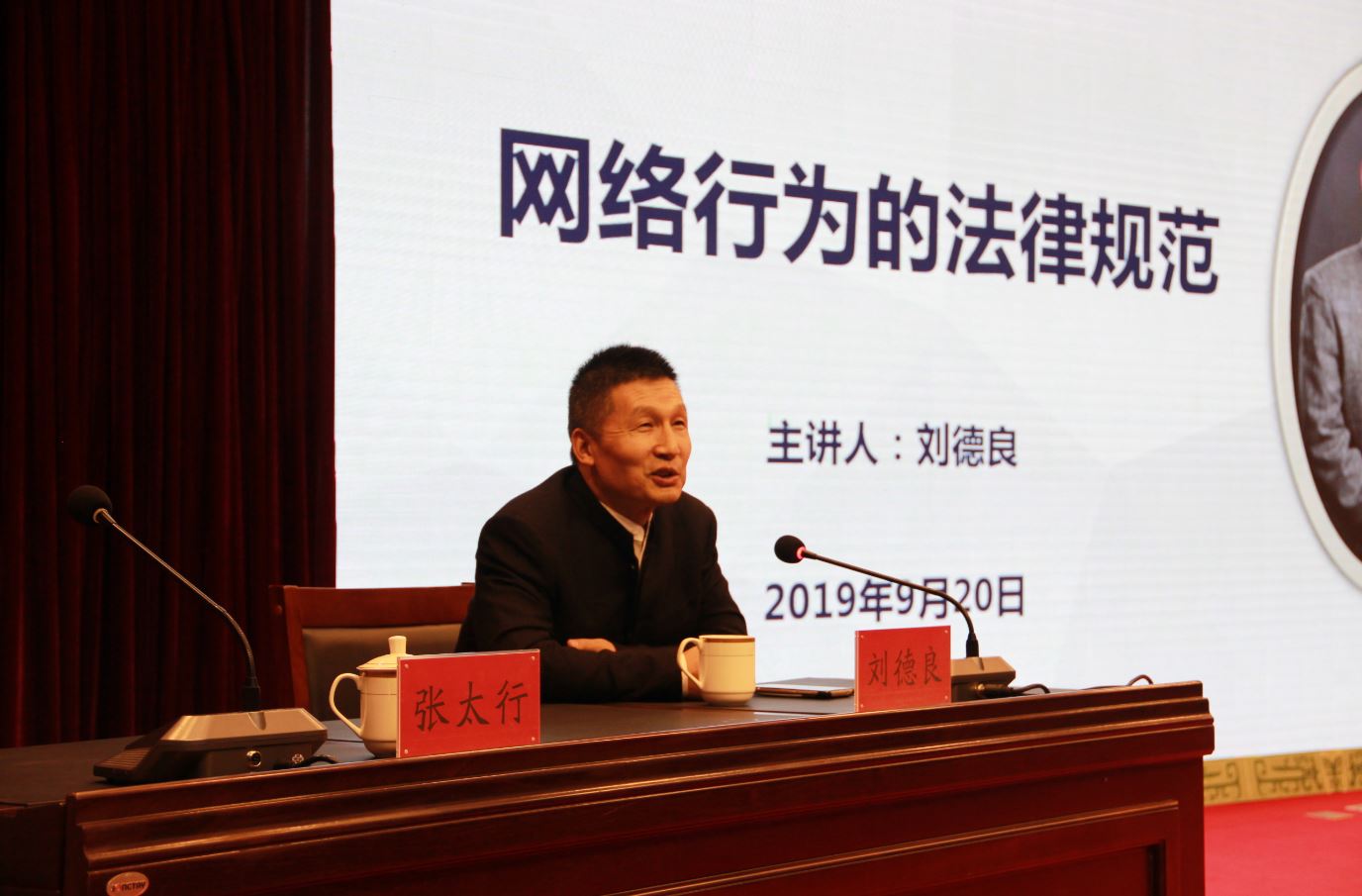 本网讯(文/余孝奎 图/吴金堂)2019年9月20日,正值国家网络安全宣传周期间,北京师范大学博士生导师刘德良教授作客我校“百家论坛”,在图书馆第一报告厅作了题为“网络行为的法律规范”的学术报告,此次“百家论坛”由信息化办公室(网络中心)与学生处联合承办。讲座由信息化办公室(网络中心)副主任张太行主持。各单位、各部门分管网络信息化工作的领导及网络安全与信息化联络员、各院部辅导员及部分学生代表300余人聆听报告。